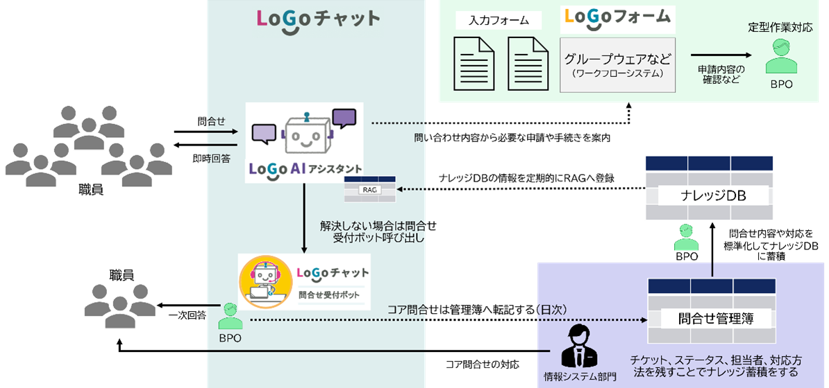 そこでチェンジ HD は今回の取り組みの一環として、これまでの問い合わせ対応の履歴や情報システム部門が管理している各種実施手順を整理し、トラストバンクが提供する自治体専用生成 AI サービス「 LoGoAI アシスタント」を活用した職員からの問い合わせに自動で対応する仕組みを構築することで、より効率的なヘルプデスク対応を実現します。