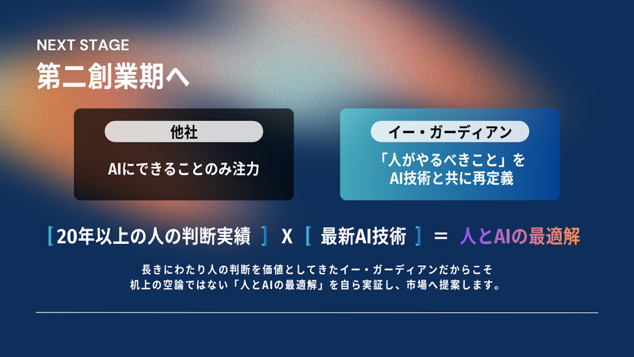当社は 20 年以上にわたり人の判断を価値として蓄積してきた企業です。だからこそ、「 AI にできること」に注目が集まる中で、「人がやるべきこと」を再定義し、新たな価値とともに提案できると考えています。人× AI の最適解を自ら実証し、その価値を市場や顧客の皆様に提案していく----それが当社の描く第二創業期の姿であり、 AI 戦略統括部が担う大きなミッションです。