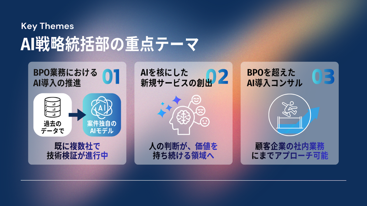 このたび新設した「 AI 戦略統括部」では、大手企業での事業開発や AI ベンチャーでの BPO 支援など豊富な実績を持つ山田 喬を統括責任者として招聘しました。本組織では、 BPO 業務への AI 導入推進、 AI 技術を活用した新規サービスの創出、顧客企業の社内業務における AI 導入支援コンサルティングを重点テーマと掲げ、 AI 領域のプロフェッショナル人材が多数参画のもと、机上の空論ではない"人× AI の最適解"を実証・提案する体制を構築してまいります。