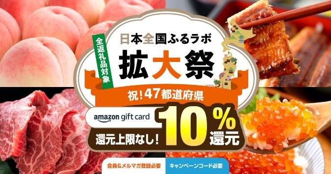 この度の連携を記念し「日本全国ふるラボ拡大祭」キャンペーンとして、「ふるラボ」にて、寄付⾦額の 10%相当の Amazon ギフトカードをプレゼントするキャンペーンを実施いたします。
