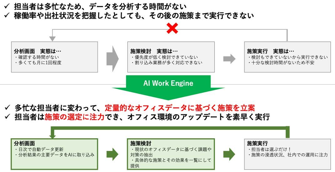 これらの課題を解決するため、「AI WORK ENGINE」は 「データ分析」×「AIによる施策提案」×「監修者による実行支援」 を組み合わせた新しいソリューションを提供します。オフィスのみならず、人材不足で仕事のやり方を変えなければならないワークプレイス全体の改善にコミットしてまいります。